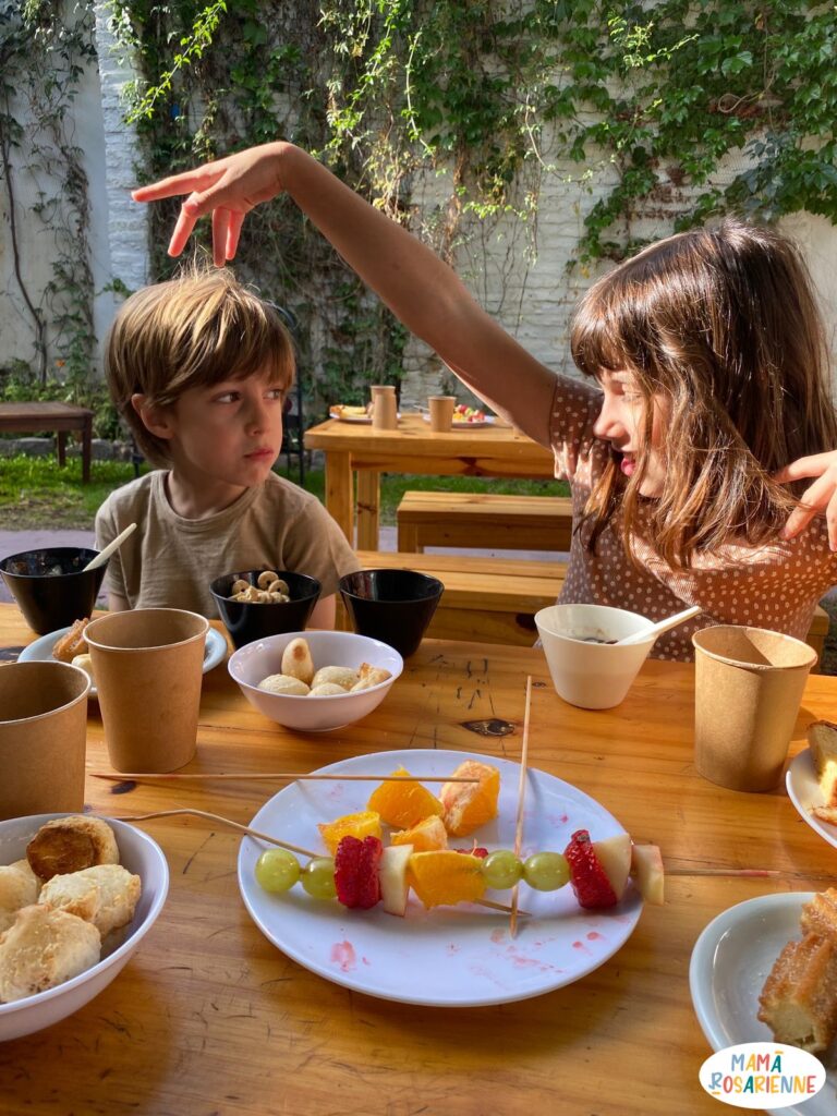 Además el catering para niños incluye opciones de alimentación razonable y saludable como frutas, cereales, yogurt , licuado de banana y chipá.